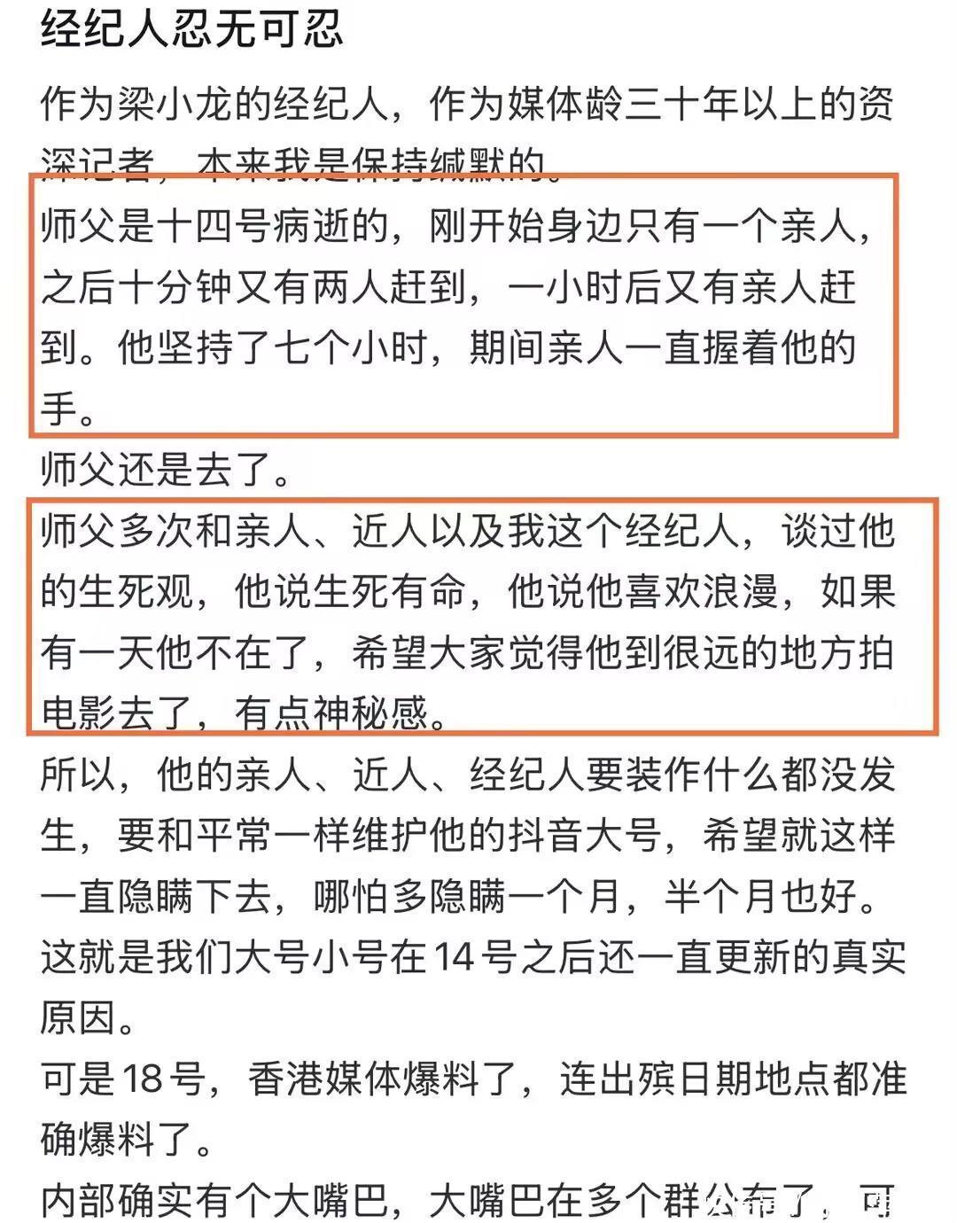 梁小龙去世后,社交账号在不知情下继续发内容,引发质疑,视频里老人穿蓝西装谈严惩人贩子,拍摄角度单一,时间落款1月14号(去世当天),部分网友视为利用逝者炒作,互动量上升,经纪人称按生前意愿,帮公众逐步接受离世,但陈光标公开说被过度劳累致死,网络两派对立。梁小龙晚年身体差,频繁商演、直播、教学,身心俱疲,短视频里眼神空洞、气力不足,团队仍安排大量工作,陈光标透露最后见面时,梁小龙因过度劳累极度虚弱,仍坚持工作,高强度节奏致突发心脏衰竭,抢救无效,公众痛心离世,质疑团队忽视健康需求,过度追求商业利益。