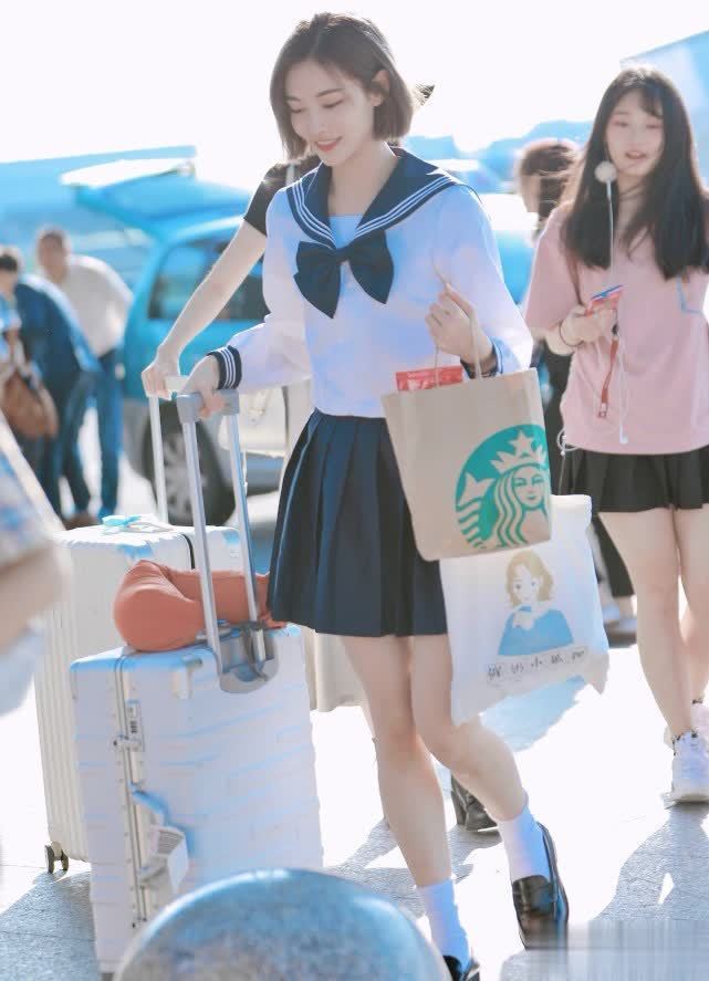在穿海军风衬衫配百褶裙的时候,人们往往会选择小皮鞋配白色袜子,很有少女感。这样的经典黑白配衬托出许佳琪白皙修长的双腿,将高挑的身材展现出来,特别好看。你们喜欢许佳琪这样的甜美装扮吗?