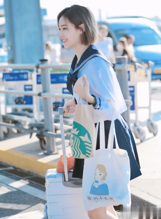 白色与宝蓝的配色十分和谐,校园风十足,看着也很减龄,直接将人带到美好的校园生活中去。许佳琪选择的这套蓝白配的服装是比较简约好看的,上衣属于短款宽松的版型,与百褶裙的搭配展现出苗条的身材。