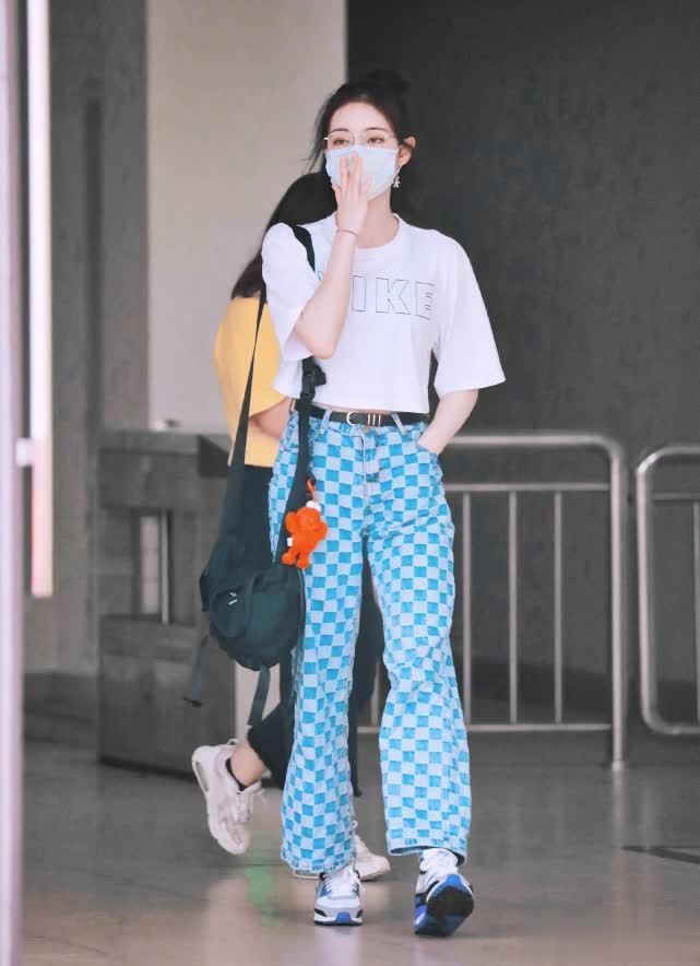 白t恤可谓是永不过时的经典单品了,不管是搭配什么风格的单品,都不会出错。许佳琪穿白色T恤配蓝色的格子牛仔裤,属于阔腿裤的版型,休闲范十足,高腰设计也提升了腰线,显得双腿更修长了。